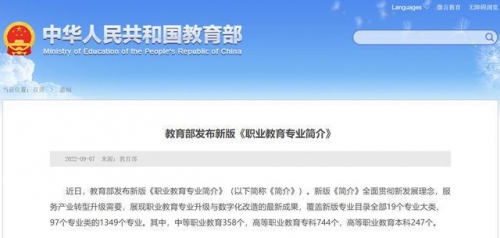 近日,教育部发布新版《职业教育专业简介》(以下简称《简介》)。新版《简介》全面贯彻新发展理念,服务产业转型升级需要,展现职业教育专业升级与数字化改造的最新成果,覆盖新版专业目录全部19个专业大类、97个专业类的1349个专业。其中,中等职业教育358个,高等职业教育专科744个,高等职业教育本科247个。